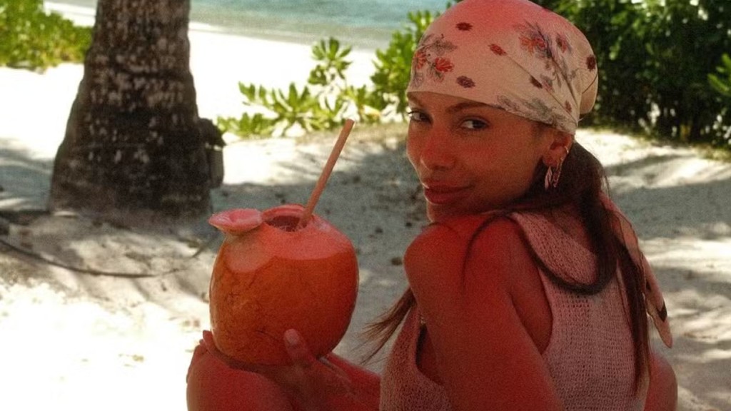 Nesta segunda-feira (13), a cantora encantou os fãs ao postar novas fotos cercada por paisagens litorâneas deslumbrantes, curtindo uma praia isolada com água de coco e sombra à beira-mar.