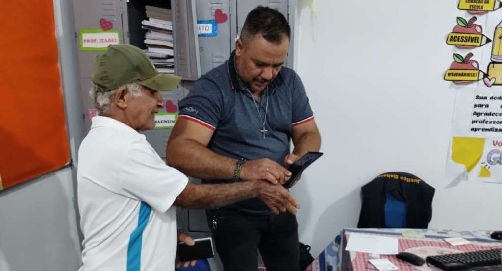 #ParaTodosVerem: A imagem mostra um homem idoso, de camisa branca e boné verde, coletando a biometria com um servidor de camisa cinza. Os homens estão em uma sala de paredes brancas, com um armário ao fundo e uma mesa com aparelhos eletrônicos e itens de papelaria.