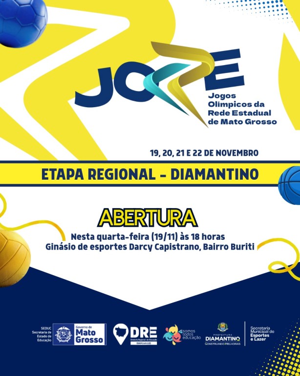 Diamantino recebe, entre os dias 19 e 22 de novembro, a etapa regional dos 1º Jogos Olímpicos da Rede Estadual de Educação de Mato Grosso (JORE). A cerimônia de abertura será realizada nesta quarta-feira (19.11), às 19h, no Ginásio Poliesportivo Darcy Capistrano, no bairro Buriti.