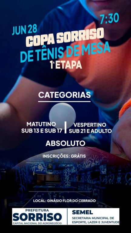 No próximo sábado (28), a partir das 7h30, o Ginásio Flor do Cerrado será local das disputas da 1ª Etapa da Copa Sorriso de Tênis de Mesa, promovida pela Prefeitura de Sorriso, por meio da Secretaria Municipal de Esporte, Lazer e Juventude. A competição reunirá atletas de várias categorias ao longo de todo o dia, com inscrições gratuitas realizadas no próprio local do evento.