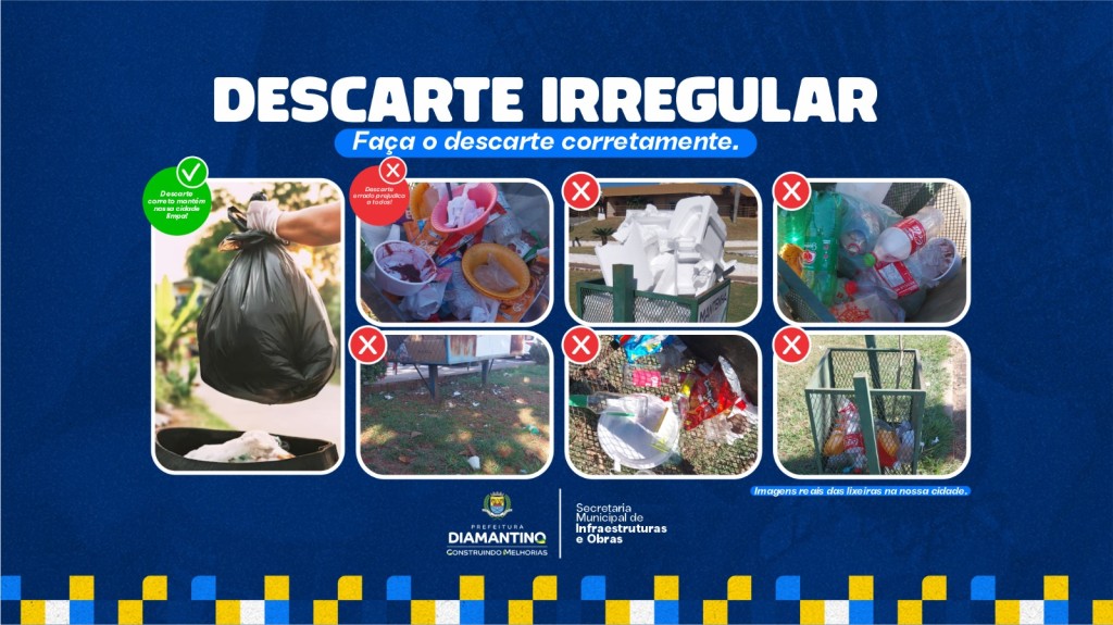 A Prefeitura de Diamantino, por meio da Secretaria Municipal de Infraestrutura e Obras, reforça a importância da conscientização da comunidade quanto ao descarte adequado de resíduos sólidos urbanos em locais públicos. Todo resíduo deve ser colocado em sacos plásticos fechados, inclusive quando descartado em lixeiras comunitárias.