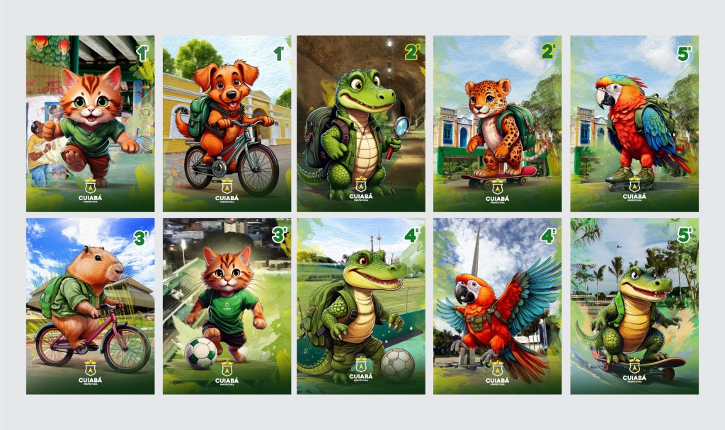 A imagem que ilustra essa notícia apresenta as ilustrações candidatas para as capas dos materiais didáticos da rede pública de ensino de Cuiabá para 2025. Cada série do 1º ao 5º ano é representada por dois animais da fauna regional em situações lúdicas, com elementos que remetem à cultura local e a educação.